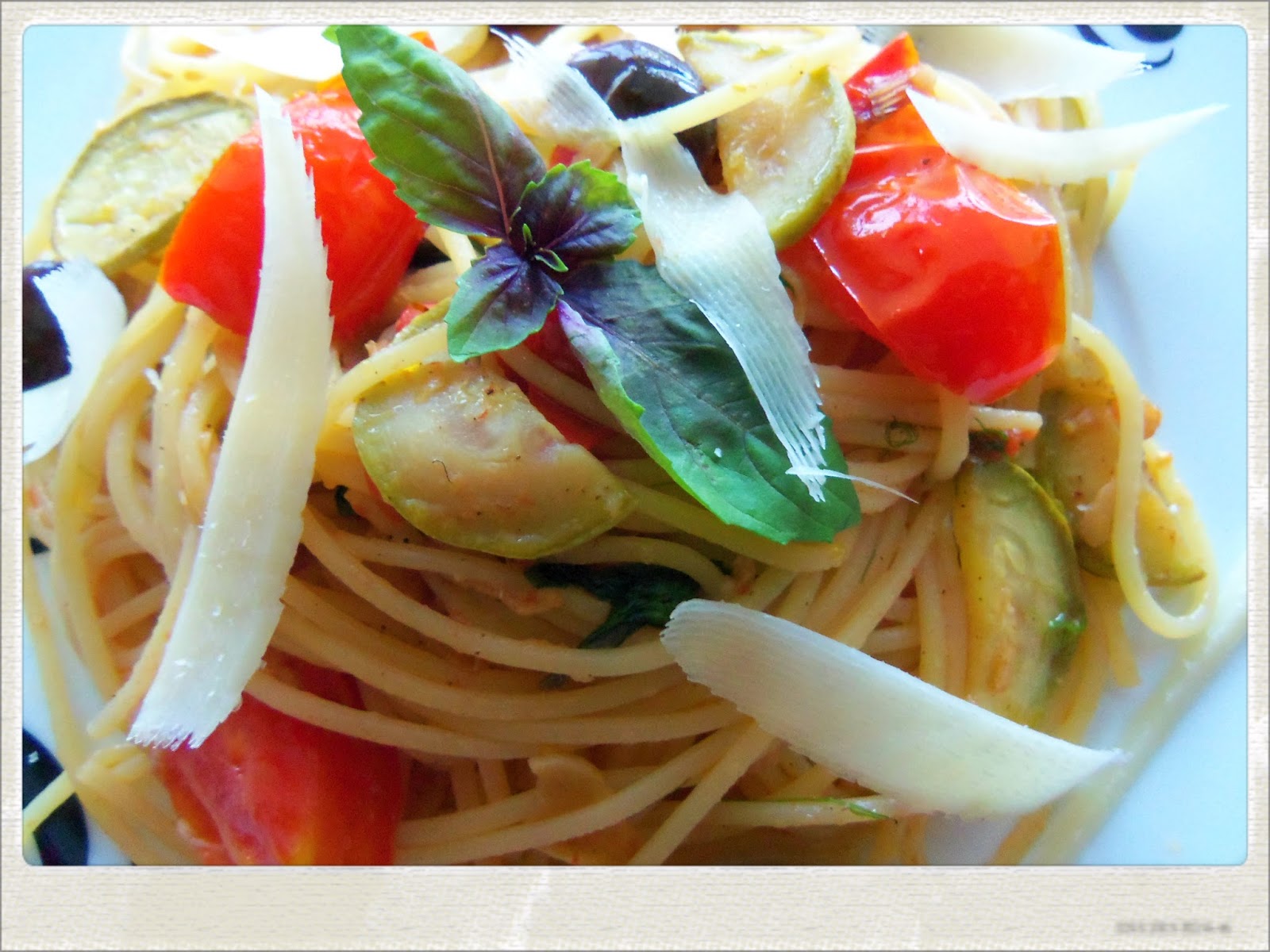 This recipe takes no time to cook, you can just do everything while the pasta boils. In my case 8 minutes, and it went like this: hot pan, a good amount of olive oil (about 4-5 tbs, you need it to coat the pasta), put the fennel in, cook for 2 minutes, add the rest of the ingredients and cook for another 4 minutes of high heat. Cook the pasta just under al-dente (6-7 minutes), then add them to the veggies and stir them in for another minute, adding in a couple of tbs. of olive oil to coat the pasta better. Plate it and sprinkle on top with some parmiggiano strips (use a veggie peeler to cut nice, thin strips of cheese) and more basil leaves and fennel leaves.